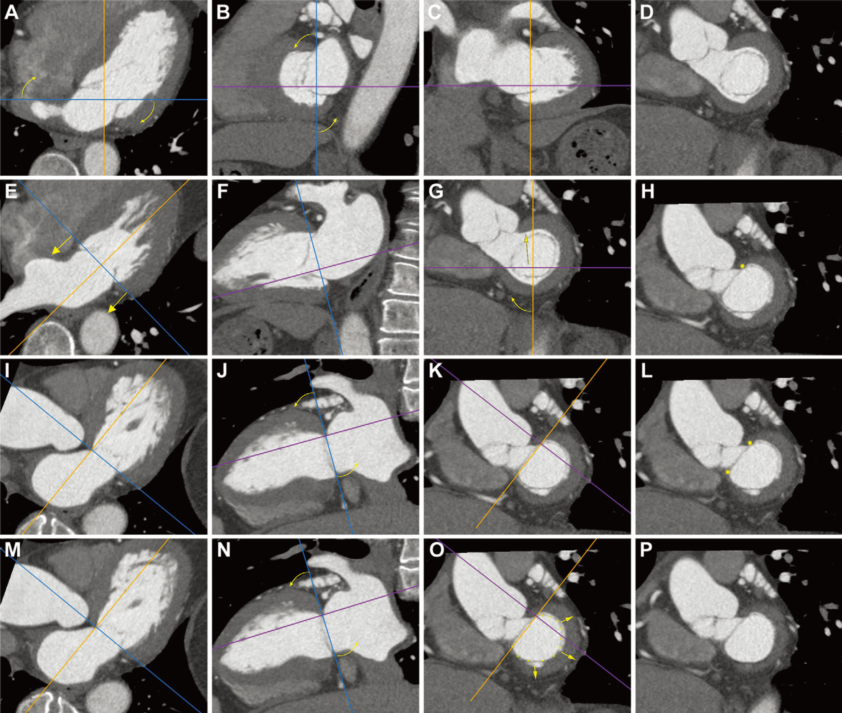 图1 MSCT构建D形二尖瓣环模型主要步骤(A-P):弯曲箭头表示旋转图像,直箭头表示在不改变其角度的情况下移动平面