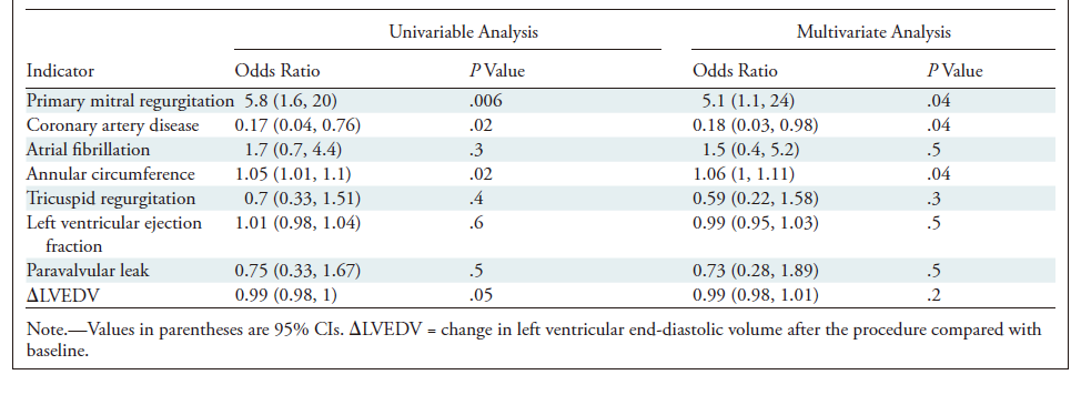 研究发现104例合并中或重度MR患者(平均年龄74岁±7;61名男性)行TAVR治疗后,79例患者MR得以改善,且MR的改善在TAVR术后1年最为明显。D型二尖瓣环形态参数,包括瓣环周长(OR, 1.05; 95% CI: 1.01, 1.1; P = .02)、左右纤维三角间径(OR, 1.2; 95% CI: 1.03, 1.39; P = .02)和联合间径(OR, 1.15; 95% CI: 1.02, 1.31; P = .02)均与二尖瓣反流未改善相关。此外,合并冠心病的患者TAVR术后MR改善更大(OR, 0.17; 95% CI: 0.04, 0.76; P = .02)。多因素分析后发现原发性二尖瓣反流(OR, 5.1; 95% CI: 1.1, 24; P = .04)和D型瓣环周长(OR, 1.06; 95% CI: 1, 1.11; P = .04)是TAVR术后二尖瓣反流未改善的独立预测因子(表1)。