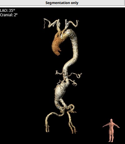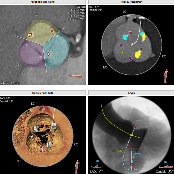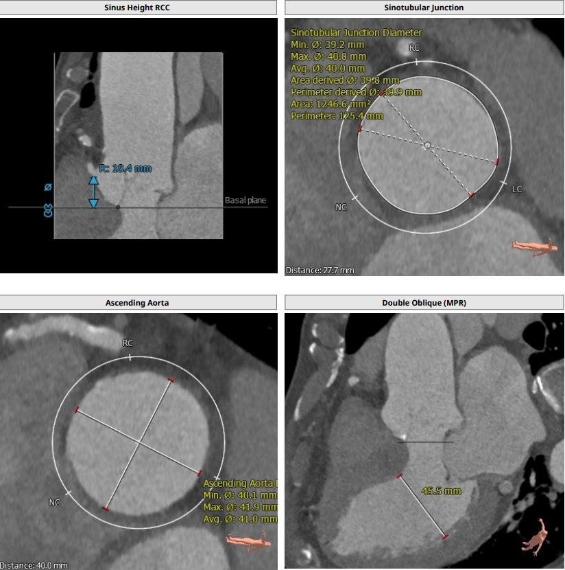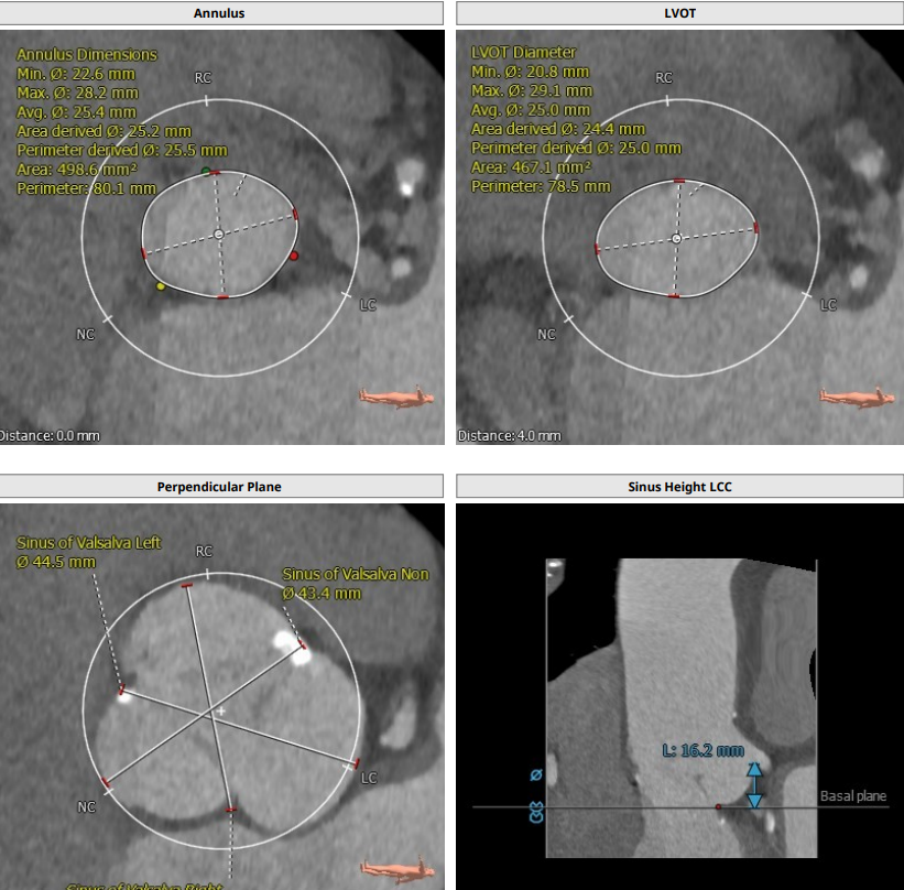 患者男,83岁,解剖为三叶瓣,瓣环径25.5,LVOT25,法式窦结构大,长短颈均超过43,左冠高度16.2,右冠高度18.4,STJ39.9,高度为27.7,升主动脉稍增宽,均径在40.1。