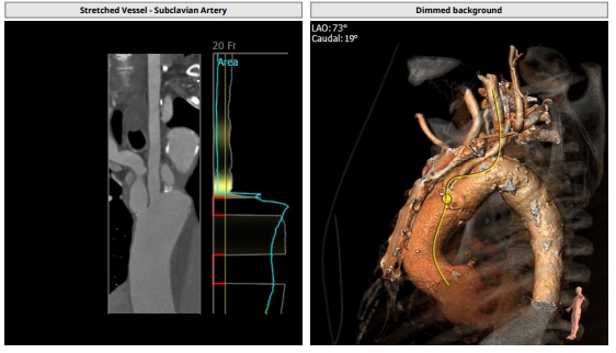 综合整体结构,决定选用VenusA29号瓣膜进行植入,VenusA29号瓣膜29MM的瓣环经相对于25.5的瓣环解剖,25的LVOT有13%以上的oversize,且STJ高度为39.9,升主为40.1,相对于VenusA29号瓣膜最大处44的特点,均可以提供锚定力。