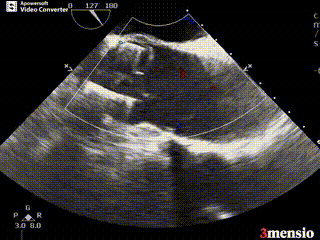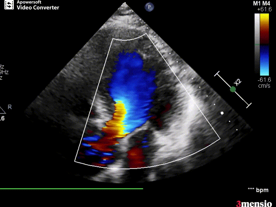 手术采用经心尖入路的策略。患者全麻后,在左侧心尖处(胸部对应位置)切开3-4cm的小切口,随即在DSA及超声引导下植入Ken-Valve瓣膜,手术仅耗时6分钟。术后即刻返流由术前大量转为消失,术后测得跨瓣压差为6mmHg,血流速度为1.2m/s。