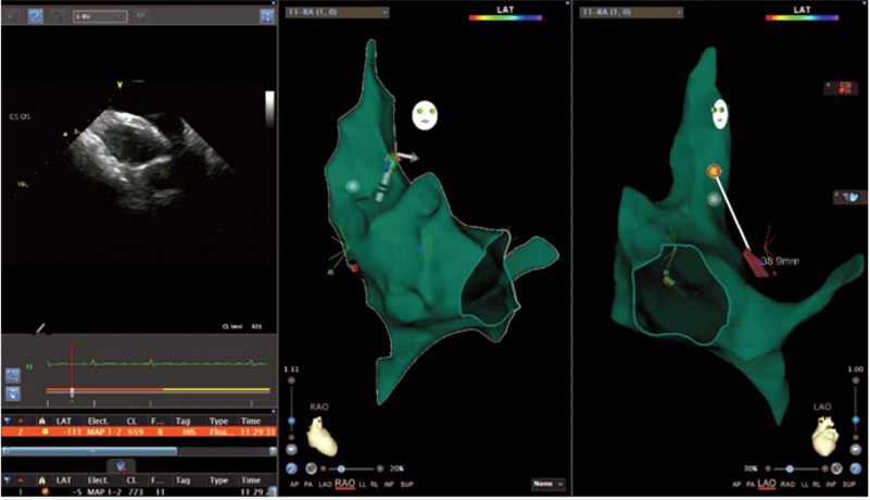本研究共入选2020年9月至12月间于我院使用改进的ICE 指引下房间隔穿刺法患者共30例,其中男性20例(66.7%) ,房颤25例(83%) ,心房扑动5例。年龄(65.8±9.4) 岁,左房前后径(39±4.8)mm。其中26例患者1针穿刺成功(87%) ,3例患者穿刺2次成功,1例患者使用X线。穿刺鞘实际通过卵圆窝部位与预设部位距5mm以内者25例(83% ) ,穿刺时间(3.3±1.2)min.,无严重并发症出现。