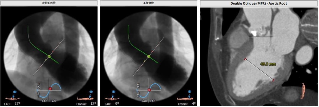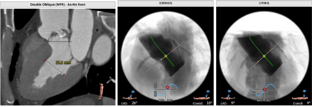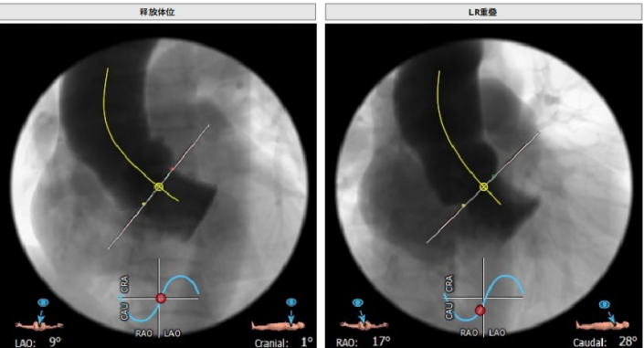 心脏角度不大,轻度钙化,左右窦黏粘;释放体位LAO 9、CRA 1;运用cusp-overlap技术定位角度;RAO17°、CAU 28° 。
