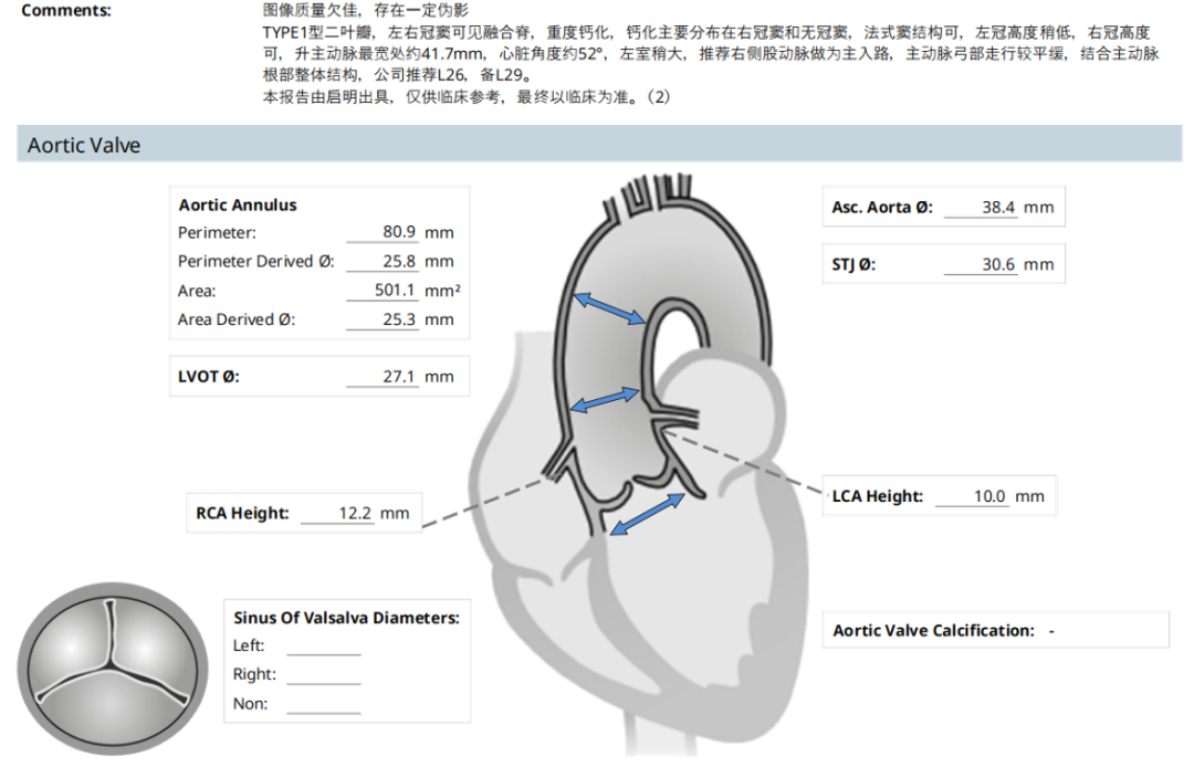 升主动脉未见增宽,心脏角度合适极重度钙化,多集中在基底部位二叶瓣重度钙化THV需要downsize选择26/29瓣膜。