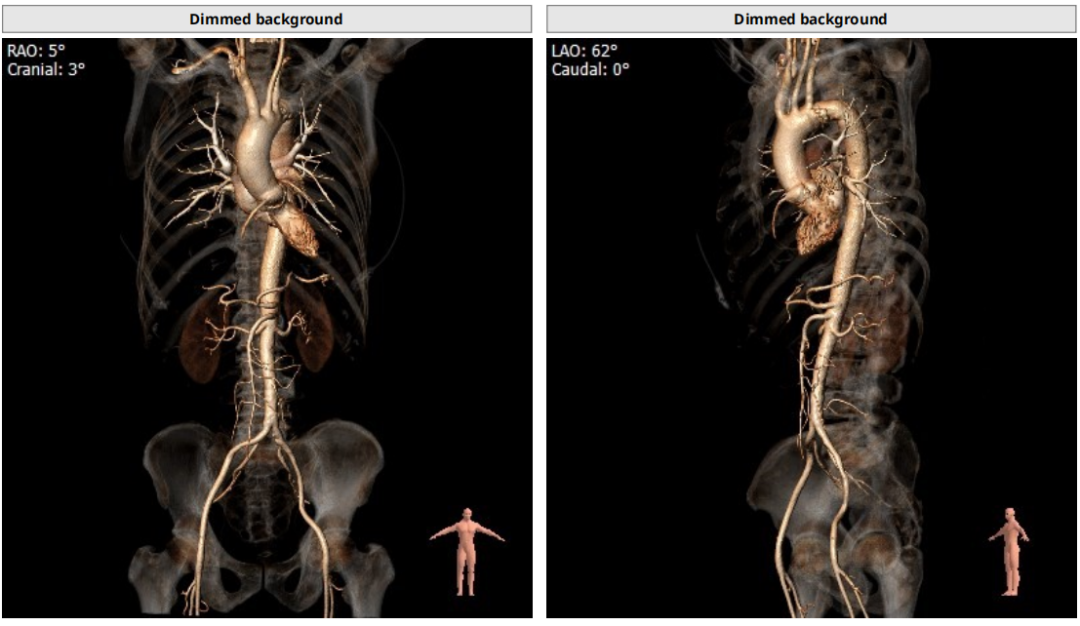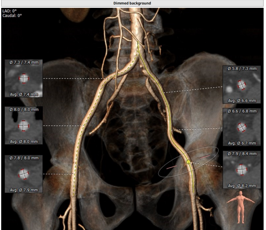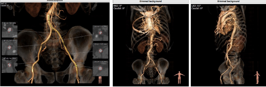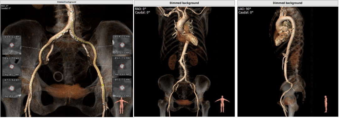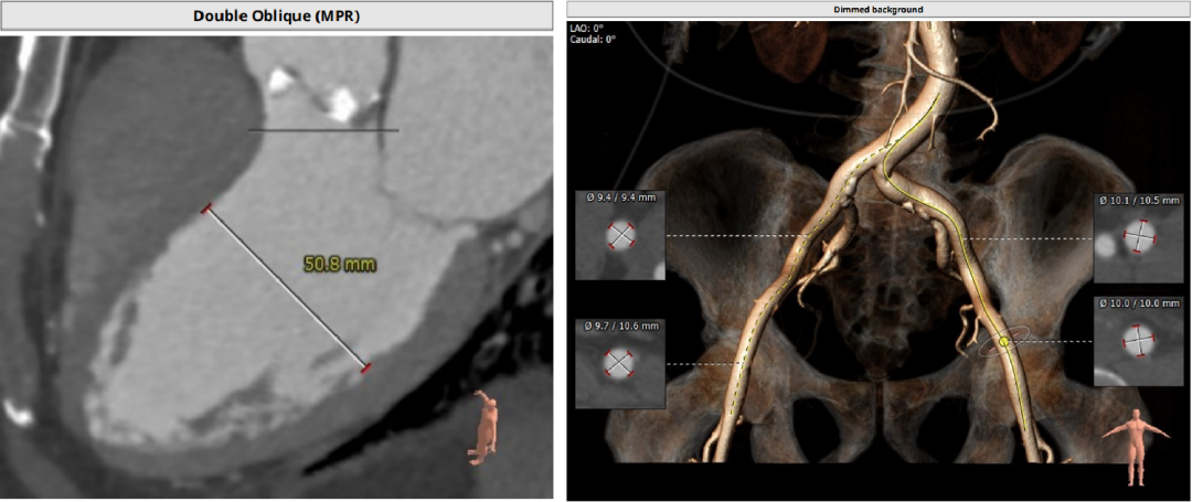 入路:入路观察是否有溃疡、钙化、迂曲、血管狭窄等情况,以判断夹层风险。该病人入路情况良好,优先选择右股作为输送系统主入路。