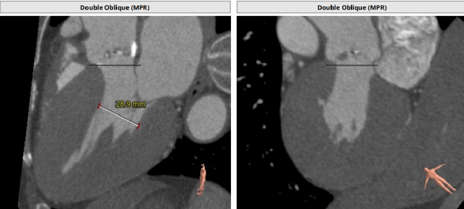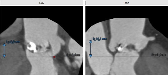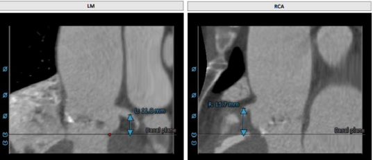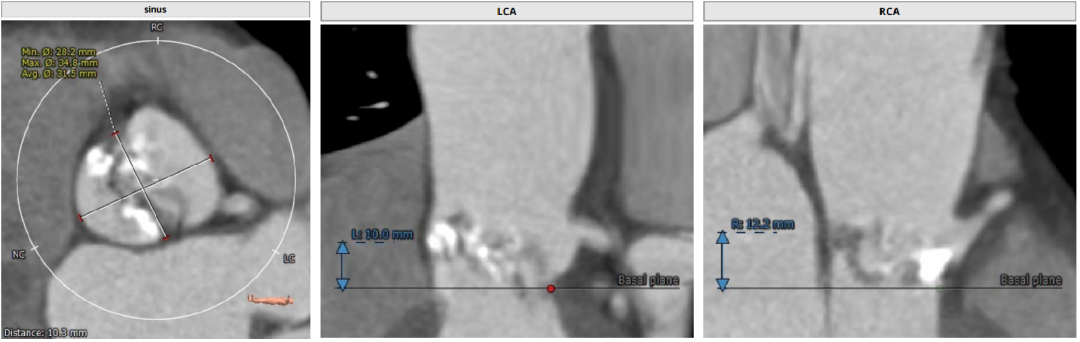 窦部的空间与左右冠脉开口高度结合瓣叶形态,是否增厚可以初步判断瓣叶是否会在瓣膜植入后遮挡冠脉开口造成急性的冠脉堵塞。该病人左冠开口略低,且钙化集中在右冠和无冠窦,判断冠脉风险较高。需术中球扩判断是否进行冠脉保护。