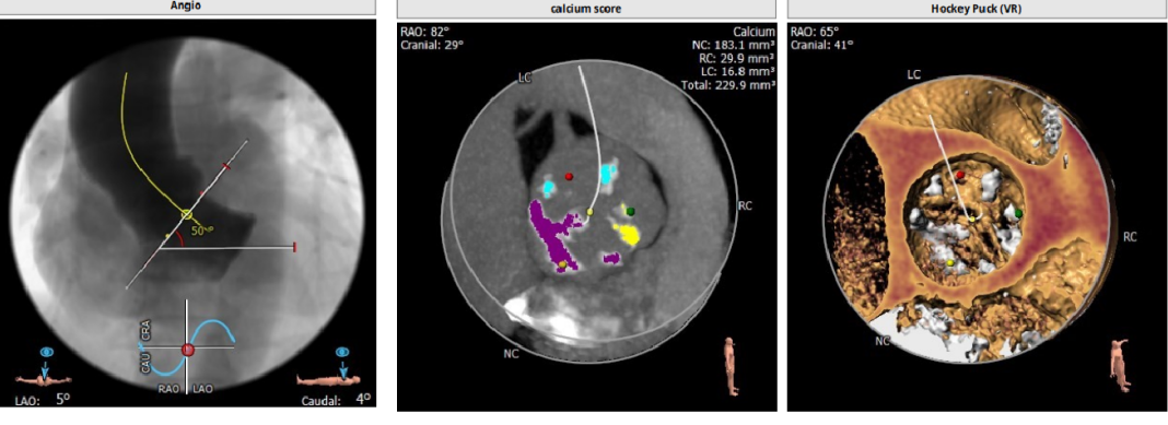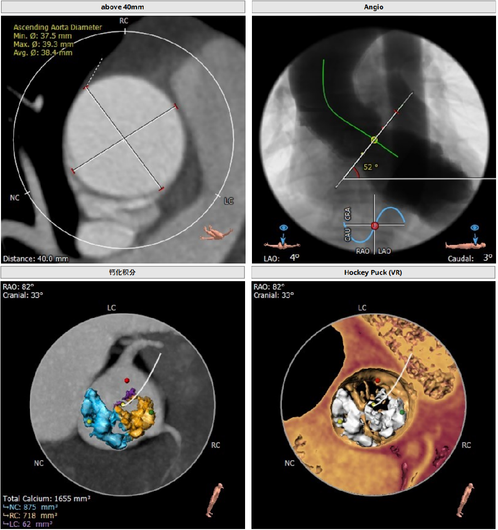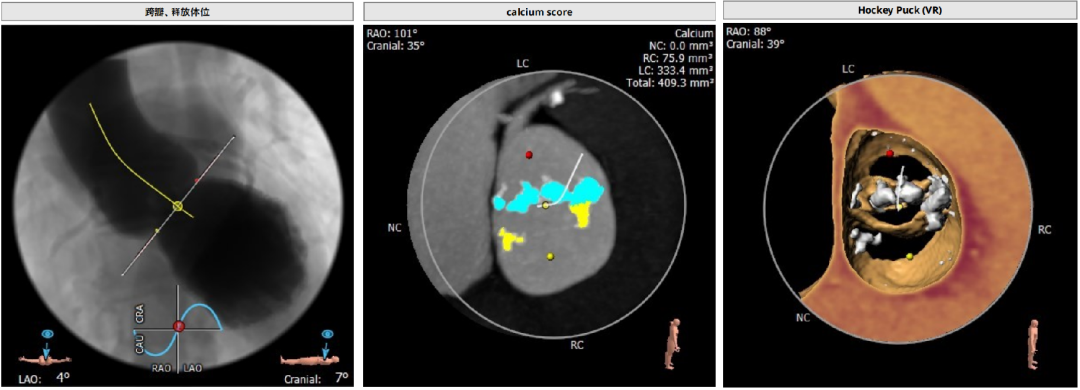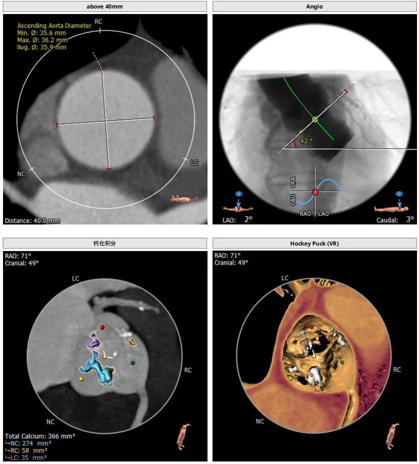 患者为二叶瓣重度狭窄并轻度返流,重度钙化,主要集中在右冠窦和无冠窦,可能会把THV往左冠方向推,左冠开口高度低,认为左冠风险大。此次手术风险大,对瓣膜释放位置要求高,两个限制条件,都大大增加了手术难度。
