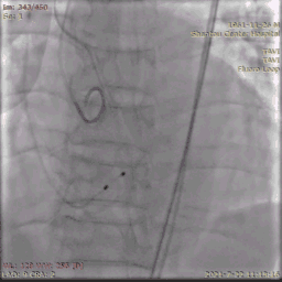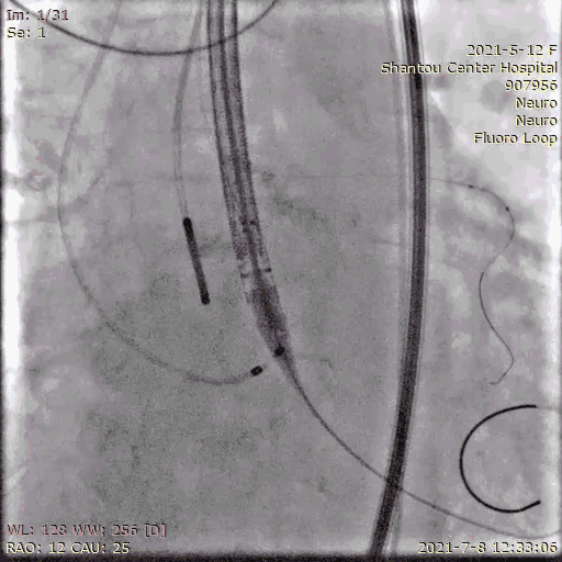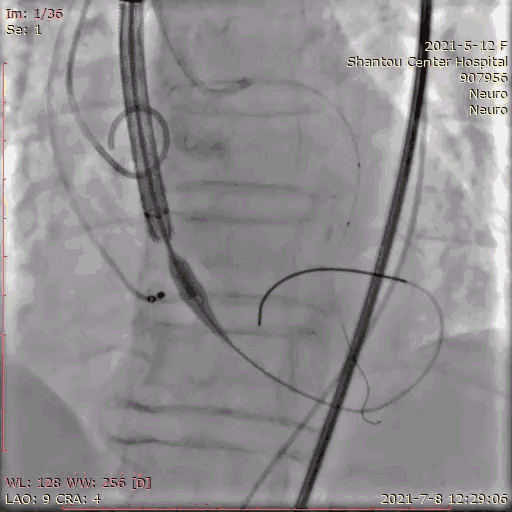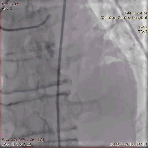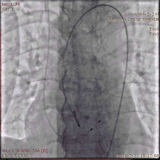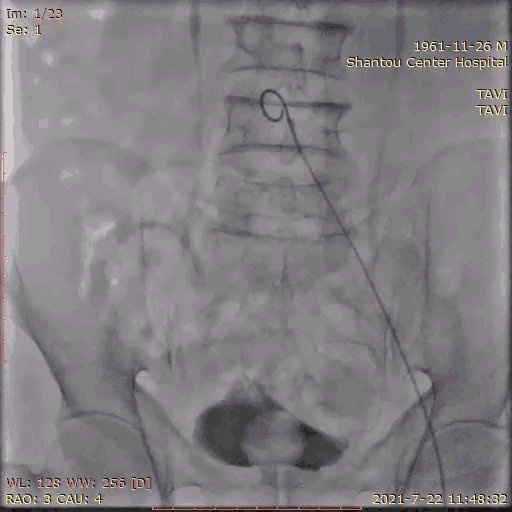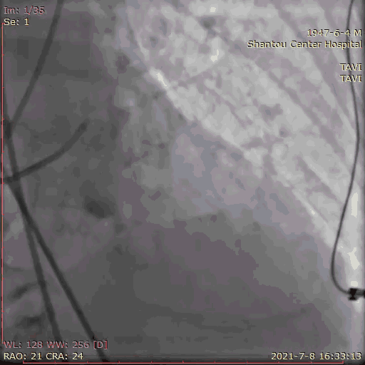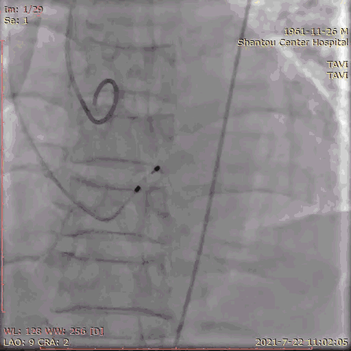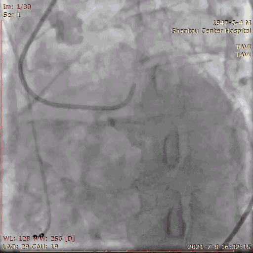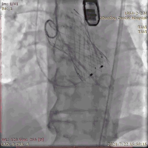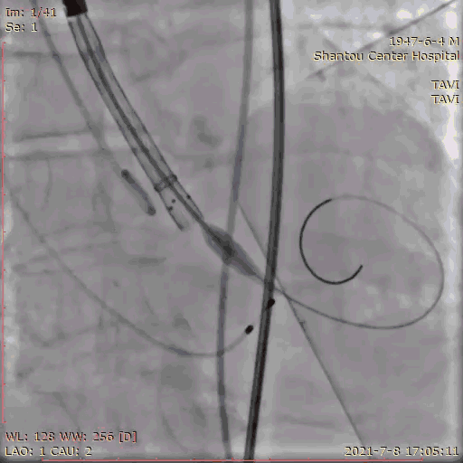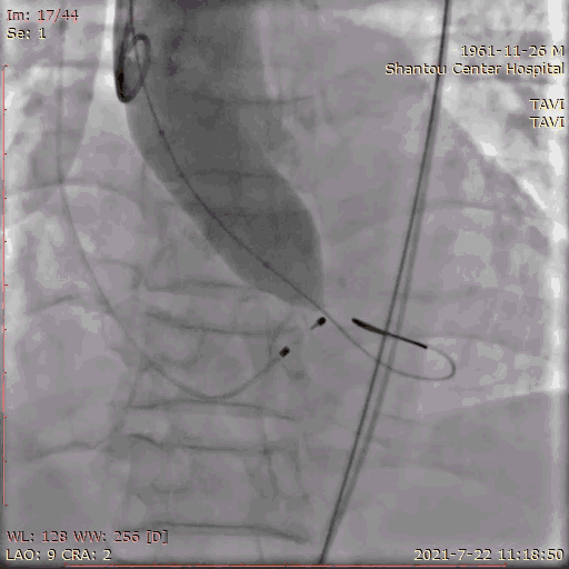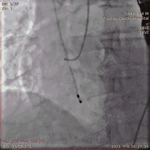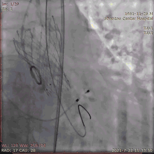 180bpm起搏后打球囊,造影,撤球囊,停起搏。22球囊预扩后,观察该患者有细微反流,左冠瓣叶略微遮挡冠脉开口,决定进行冠脉保护。