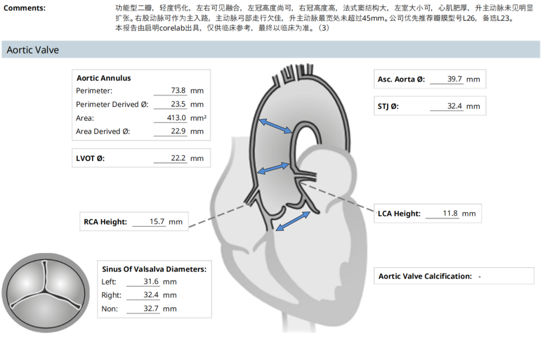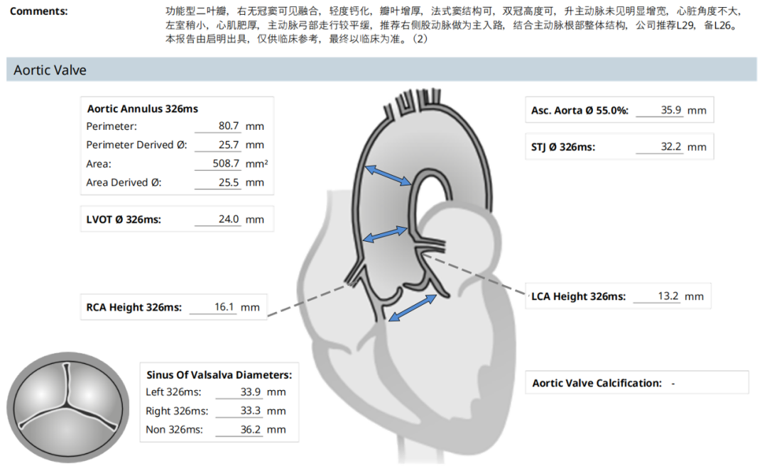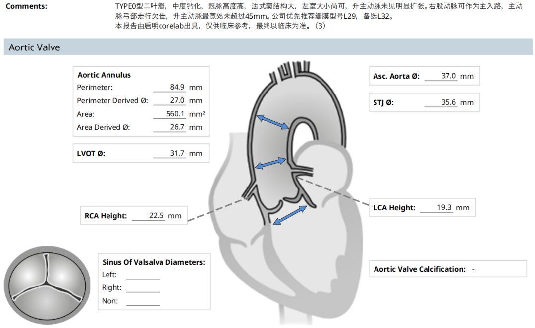 Anulus 25.7、LVOT 23.7;STJ高度可,窦部空间足够;初步预估29/32瓣膜。