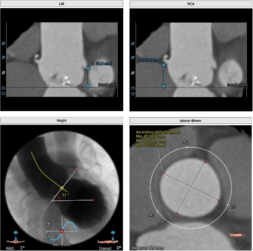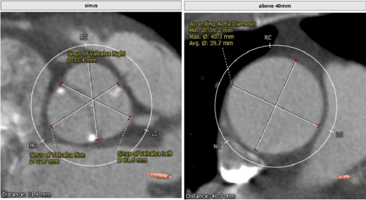 窦部短径26mm、左右冠空间足够,冠脉高度可心脏角度51°、升主未增宽。