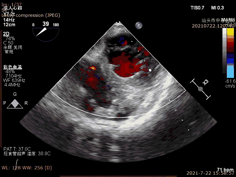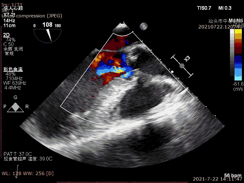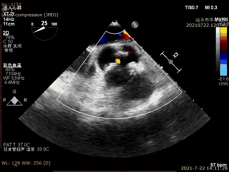 心室腔较小,左右入路正常,患者为二叶瓣轻度狭窄并轻度反流,使用Venus-A可回收输送系统,放置L26瓣膜,病人同时伴有贲门癌,改为经胸超声检测病人瓣膜形态。