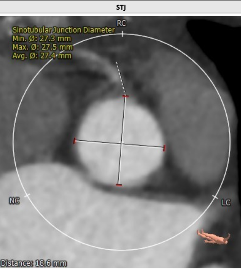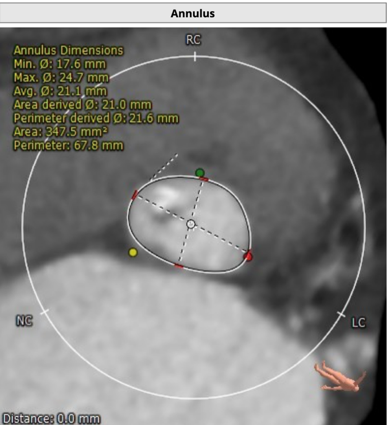 患者为73岁老年男性。CT评估显示其为三叶瓣,伴有轻度钙化,双冠高度可,升主动脉未见明显增宽,主动脉弓部角度平缓。瓣环最短径为17.6mm,最长径为24.7mm,平均瓣环直径为21.1mm。升主动脉平均直径33.6mm。左冠开口高度12.0mm,右冠开口高度14.2mm,冠脉阻塞风险低。外周血管未见明显钙化,最窄处直径为5.7mm。入路情况较佳。