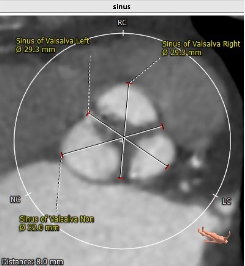 结合CT分析,李自成教授团队考虑使用右侧股动脉做为主入路,由于左侧髂总动脉近腹主动脉分叉处局部狭窄,考虑副路选择桡动脉;拟选用VenusA-Plus 26型号瓣膜植入。