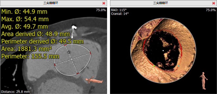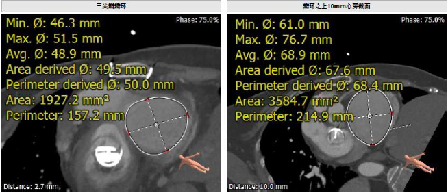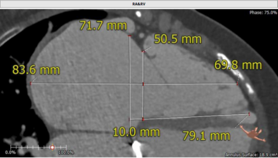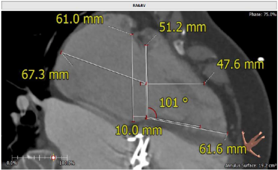 患者为68岁女性,14年前因“反复感冒、气促”,检查发现心脏瓣膜病,接受了“二尖瓣机械瓣置换术”。约5年前出现双下肢水肿,活动后心累气紧,心脏彩超提示:三尖瓣返流。近年来三尖瓣返流逐渐加重并伴有轻微黄疸、双下肢水肿,虽长期服用利尿剂治疗,但效果欠佳。郭惠明教授团队结合病史、超声及CT评估,考虑患者瓣膜置换术后,三尖瓣重度返流,再次开胸行体外循环手术风险高,经团队整体评估,决定采用最适合患者的LuX-Valve三尖瓣置换系统行微创治疗,根据测量结果选择植入JS/TTVI-28-55型号的LuX-Valve瓣膜。