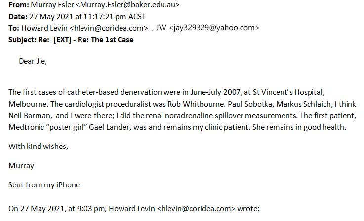 国内业界/学界对RDN疗法的来龙去脉不甚了了,有不少“胡说、乱说”的现象。如某篇文章报道说全球第一个经导管射频消融施行RDN手术的病例是由Dr. Howard Levin在2002年完成的,国内对这一说法相互引用,以误传误。我向这一领域中的权威,参与了第一例经导管射频消融施行RDN手术的Dr. Esler求证梳理脉络,以下是Dr. Esler回复我的邮件: