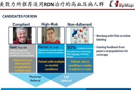 孰料美敦力公司在2012年底公布其开展的Symplicity III临床试验未能得到预期的结果,重创了行业信心。许多公司从这一领域退出。需要指出的是,欧美的基础和临床学术界始终对这一疗法抱着相当的信心,因为在这一领域中积累了太多的解剖学、组织学、生理学、病理生理学证据支持这一疗法。美敦力也坚持在这一领域中,重新设计和启动了一系列的临床试验:Spyral-Off Med和Spyral-On Med研究。随着这一系列试验结果的发布和对RDN降压效果的确认,RDN的临床适应证也发生了从难治性高血压、到控制不佳的高血压再到高血压的演变。