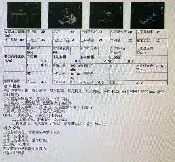 现病史:患者于3月前无明显诱因出现呼吸困难,轻微活动即可诱发,伴端坐呼吸,伴胸闷患者信息:伴双下肢轻度水肿,无咳粉红色泡沫痰,无腹胀,无晕厥,无咯血。至当地医院就诊,心脏超声示重度主动脉瓣狭窄,动态心电图示频发房早,2019年12月02日行冠脉造影示 RCA 中段次全闭塞,遂行 RCA — PCI 。术后行抗血小板、调脂、利尿处理,呼吸困难稍缓解。为进一步治疗至广东省人民医院就诊,2020年03月04日心脏超声示主动脉瓣病变,重度狭窄并重度反流,中度二尖瓣反流,中度三尖瓣反流,重度肺高压冠心病,PCI 术后:左室收缩舒张功能明显减退:少量心包积液:LVEF36%。拟诊断为“主动脉瓣狭窄合并关闭不全”收入心内科。