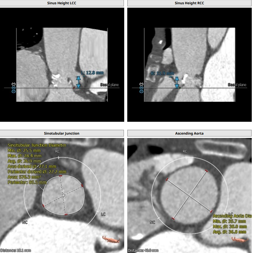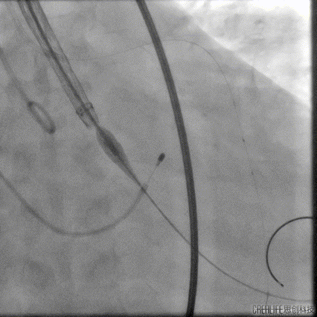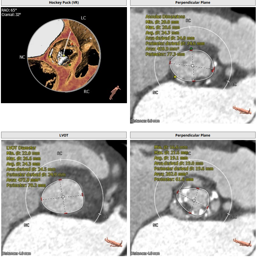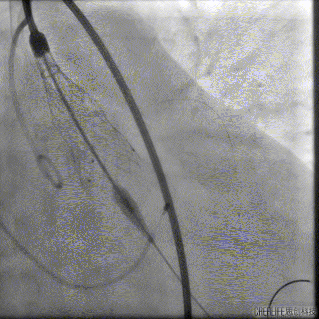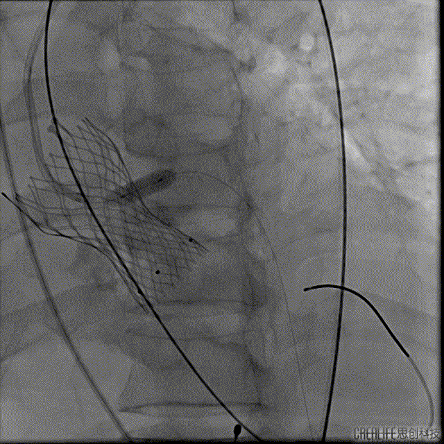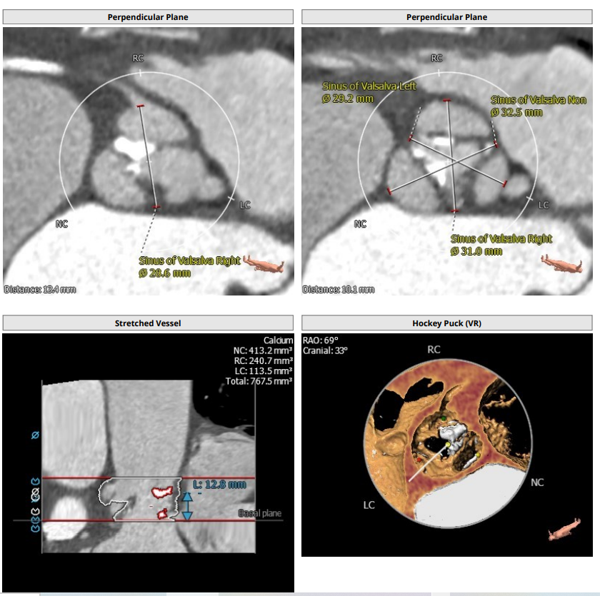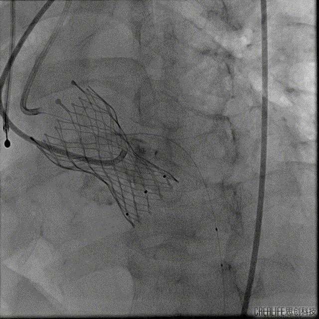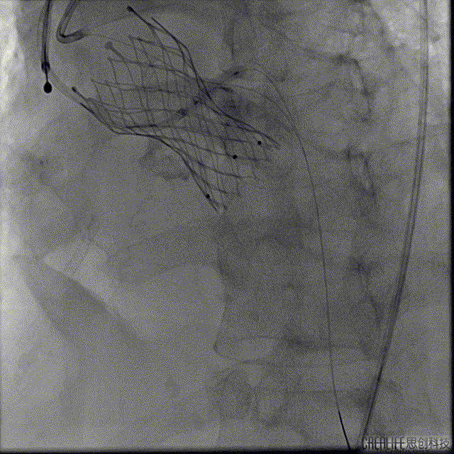 此病人瓣环为24.6,LVOT24.9,STJ27.2,法式窦长短径接近30,钙化积分767,右无窦融合,钙化较重,左窦侧瓣叶钙化较轻,瓣叶除钙化外,风湿样增厚,左冠高度12.8,右冠11.9,右无融合,左冠侧瓣叶长度到达左冠开口下缘,预计左冠风险相对较高,患者EF值低,心功能差,遂行ECMO辅助下TAVR术式。