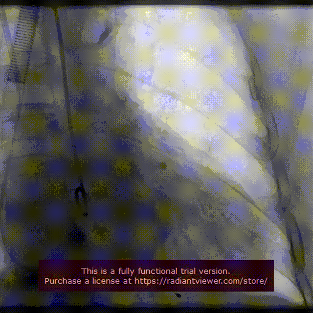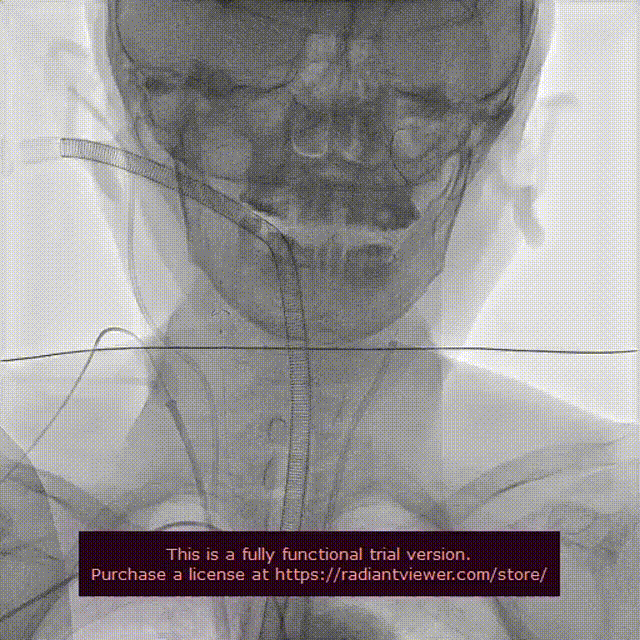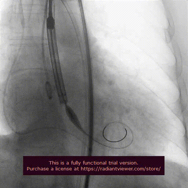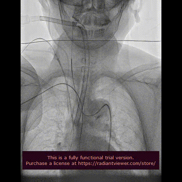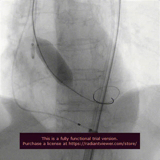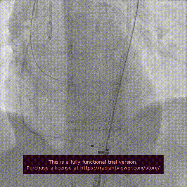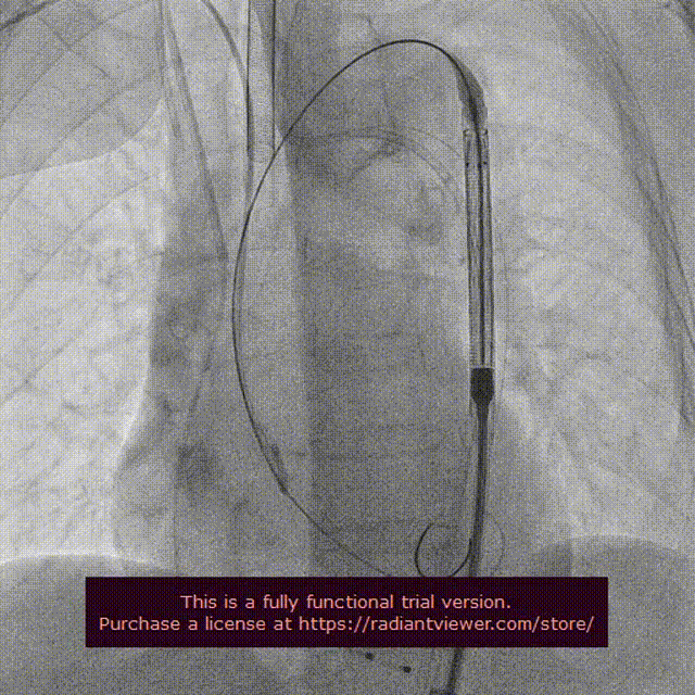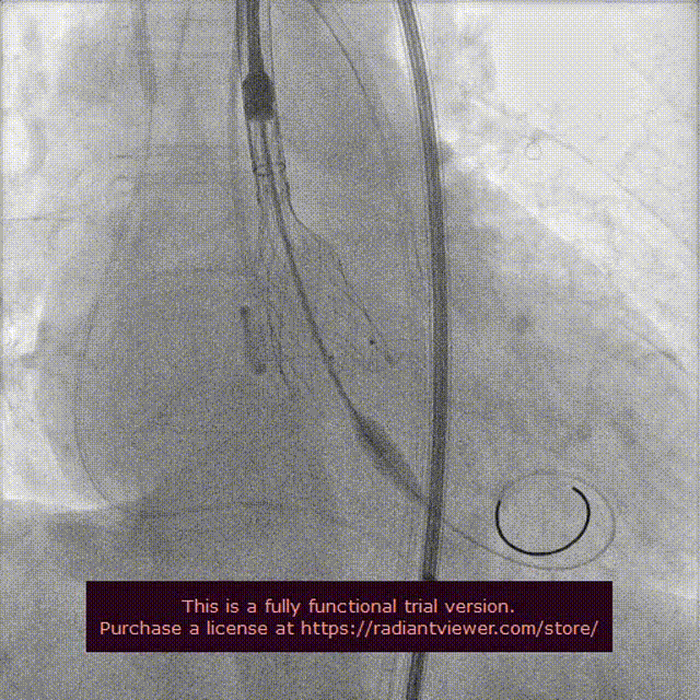患者主动脉瓣呈三叶瓣,轻度钙化,法式窦结构不大,双冠高度可,升主动脉未见明显增宽,心脏角度约55°,左室小,心肌肥厚,主动脉弓部走行较平缓,但有明显钙化斑块,考虑到术中斑块脱落导致的卒中的风险,选择颈内动脉先行植入Emboshield Nav6抗栓塞远端保护装置进行保护,再行TAVR术。