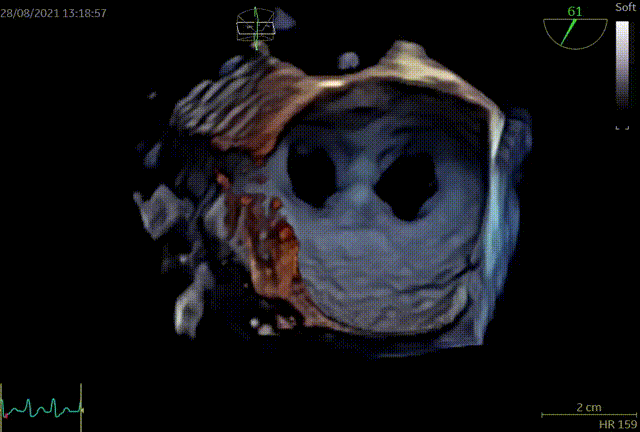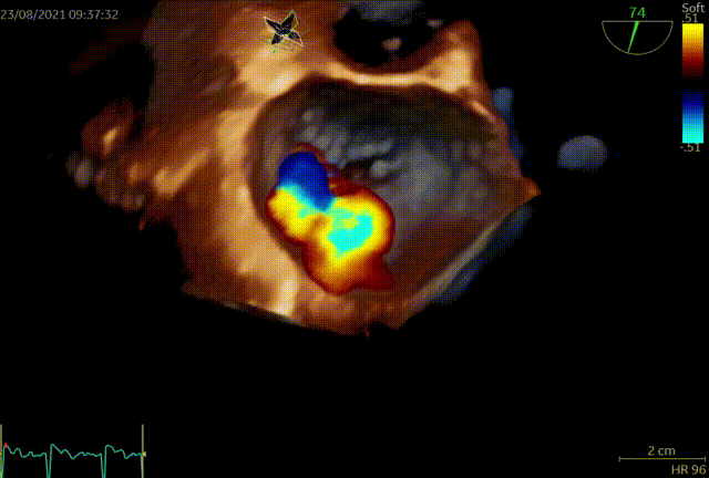 此患者为73岁男性,诊断重度功能性二尖瓣返流FMR,在最佳药物治疗3个月以上的情况下,二尖瓣返流仍无明显减轻,且临床症状显著,不能平卧,反复心衰发作病史,同时患者合并房颤、高血压等多种并发症,STS评分8.6 %,经过心脏团队多学科讨论,评定患者不适合传统外科手术,决定行经导管二尖瓣缘对缘修复手术。