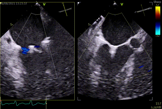 术后TEE提示,二尖瓣夹植入后返流基本消失,双孔化形成