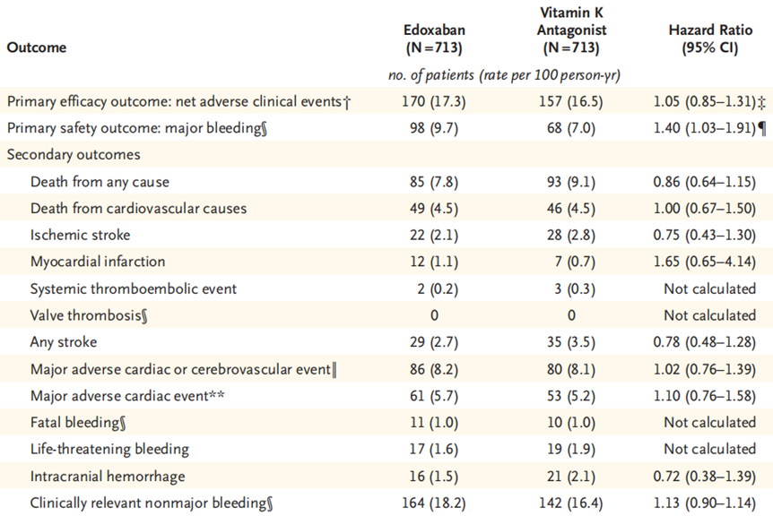 Edoxaban versus Vitamin K Antagonist for Atrial Fibrillation after TAVR. N Engl J Med. 2021 Aug 28. doi: 10.1056/NEJMoa2111016. Online ahead of print.