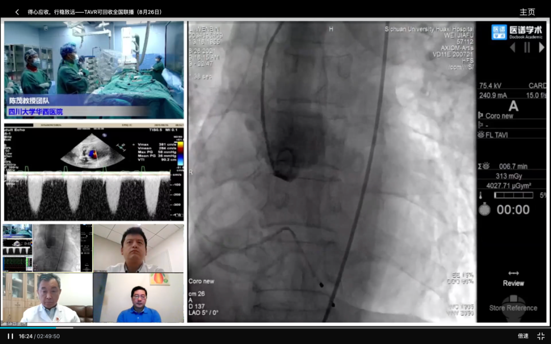 2021年8月26日,四川大学华西医院陈茂、冯沅教授团队在“得心应收,行稳致远”主题联播活动中演示了一例高难度TAVR手术,成功为一例严重心衰解剖结构复杂的重度主动脉瓣狭窄的患者进行了经导管主动脉瓣置换术。术中四川大学华西医院陈茂、冯沅教授团队使用了TaurusElite®的可回收功能的两种使用方式(部分回收及全部回收),最终实现了瓣膜位置的精准释放,获得了相对完美的结果,术后即刻患者心衰及血流动力学都获得显著改善,这也是该系统上市后华西陈茂及冯沅教授团队首次植入,在新一代TaurusElite®可回收功能的保驾护航下更从容的进行选择策略、演示了教科书式的TAVR手术。