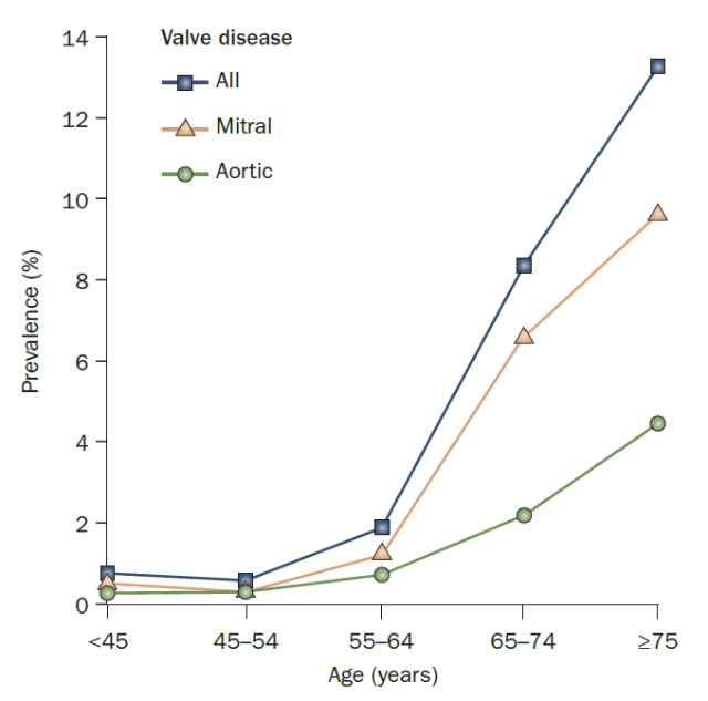 世界卫生组织(WHO)多次研究显示,心脑血管是全球死因第一位,占到所有死亡人数的1/3。其中,心脏病在过去20年里一直是“头号杀手”,目前死于心脏病的人数占全部死亡人数的16%。在过去,冠心病和高血压等两种疾病一直受到重视,他们也被列为第一和第二重要心血管的疾病。随着人口老龄化,老年性心脏瓣膜病也开始受到重视,西方学者提出瓣膜病已成为第三重要的心血管疾病,比房颤、心肌病、心衰及老年心电传导退化都常见(Med Clin North Am. 2006;90(5):849-62)。一项研究显示,在大于75岁的人群中,心脏瓣膜病的发病率为13.2%(Lancet 2006; 368: 1005–11)。在80-89岁的人群中,主动脉瓣狭窄发病率为9.8%(Heart 2013;99:396–400)。Framingham研究显示,在一组70-83岁人群,二尖瓣反流(中度以上)发病率为11.1%(Am J Cardiol. 1999;83(6):897-902)。心脏瓣膜病的发病率与年龄明显正相关,65岁以后,急剧上升(图2,Lancet 2006; 368: 1005–11)。综合目前文献研究结果,笔者估测,在80岁以上的人群,心脏瓣膜病的发病率至少20%。其中二尖瓣反流为最常见的疾病,主动脉瓣狭窄次之(前者约为后者3-4倍)。由于瓣膜病对健康和寿命的影响较大。随着人类寿命的延长,越来越多人寿命超过80岁,心脏病瓣膜病也将成为影响人类寿命延长的重要因素。实际上,我们对于动物年老死亡的原因还缺乏了解,因为我们没有动机和环境对动物进行大样本的详细医学观察研究。饲养宠物使得我们能够对动物进行足够详细医学研究。我们惊奇的发现,小型老年犬,瓣膜病发病率(二尖瓣反流)发病率高达30%以上,成为其年老死亡主要原因之一。因此,瓣膜病也可能是动物年老死亡的主要原因之一。