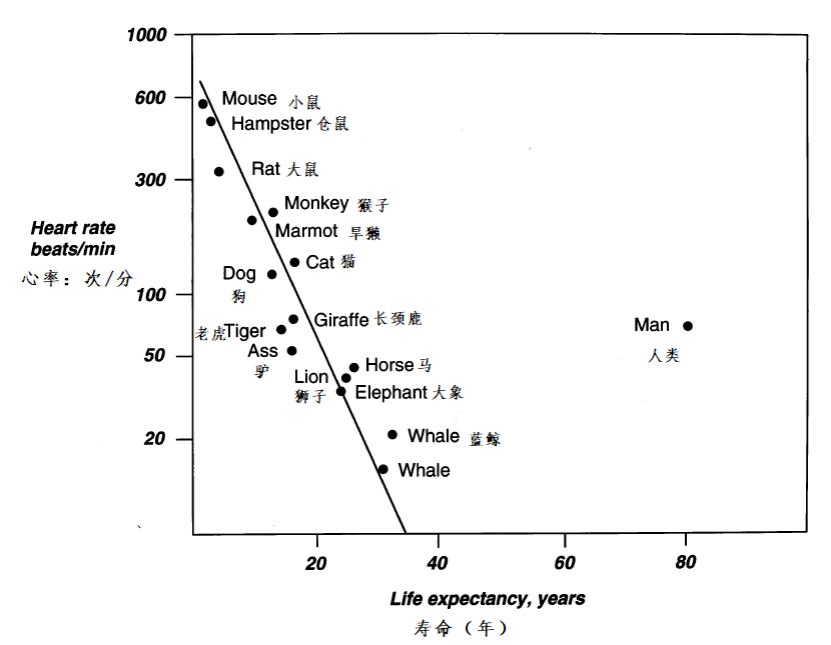 在50多年前,科学家就发现了在动物界,心率与寿命息息相关。例如人们发现,一种叫格拉帕哥斯的乌龟寿命可长达177年,它的每分钟心跳仅为6次;老鼠心率达400-500次,寿命只有1-2年。1997年,Levine HJ教授对这一现象做出详细总结,绘制了一张被广为引用的图(图1,J Am Coll Cardiol 1997;30:1104–6)。心率越高的动物,寿命越短,两者成反比关系,两者乘积为常数。哺乳动物的一生的心跳累积约为8亿次(7.3±5.6 亿次)。