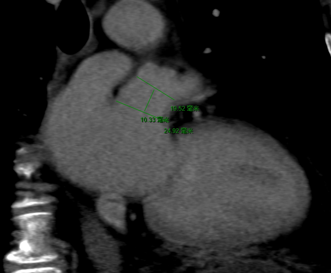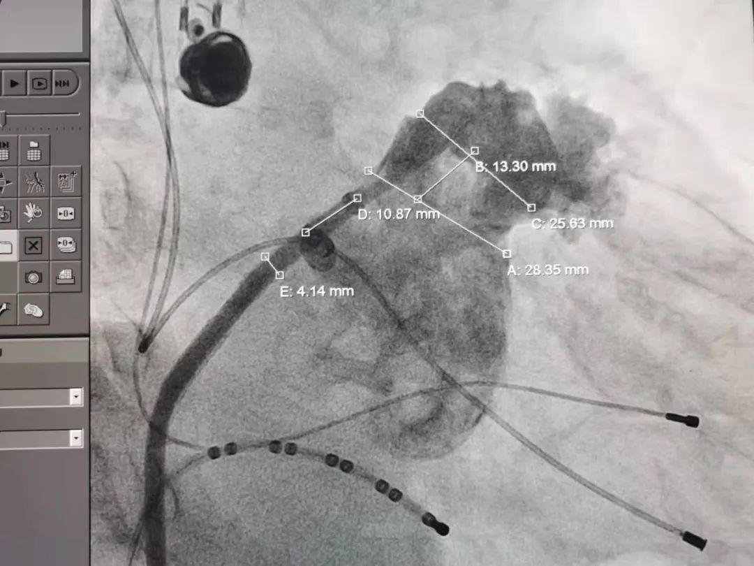 术前CT结果显示,患者左心耳形态呈鸡翅形,开口呈椭圆形,开口大小约为25mm*20mm, 左心耳深径约20mm。为解决房颤引发脑卒中的后顾之忧,姜小飞教授团队为患者定制了射频消融+左心耳封堵术“一站式”手术解决方案,且由于患者心耳内腔较大,姜小飞教授选择LAmbre™左心耳封堵器进行封堵。