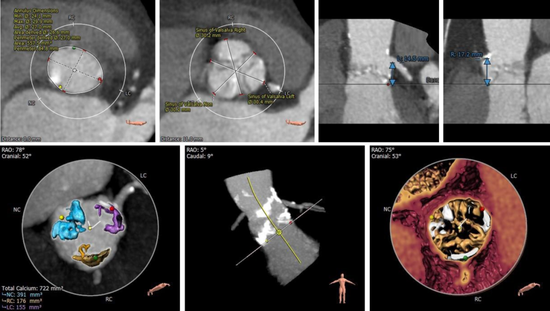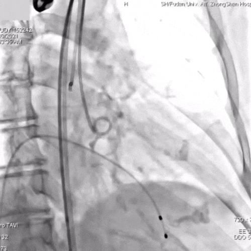患者为71岁女性,影像学检查提示三叶式主动脉瓣,瓣膜增厚钙化,开放重度受限,钙化积分HU850:722mm³,主动脉瓣口面积仅为0.7 cm²,平均跨瓣压差53 mmHg,主动脉瓣口峰值流速高达4.6 m/s,诊断为主动脉重度狭窄。葛均波院士亲自携多学科团队进行评估并制定了详细的手术方案,拟采用20 mm球囊进行预扩,植入AV26TaurusNXT主动脉瓣。术中通过多次使用回收功能寻找最理想的锚定位置和释放位点,并使用22mm 球囊进行后扩张。术后即刻经食道超声心动图评估显示仅微量瓣周漏,平均跨瓣压差仅为7 mmHg,主动脉瓣口峰值流速为1.9 m/s,术后即刻瓣口面积为2.0cm²,血流动力学指标理想。