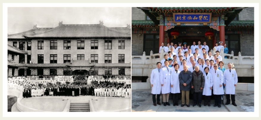 图 2 (左)1921年9月16日,北京协和医院成立;(右)北京协和医院心内科团队2020年新春合影。