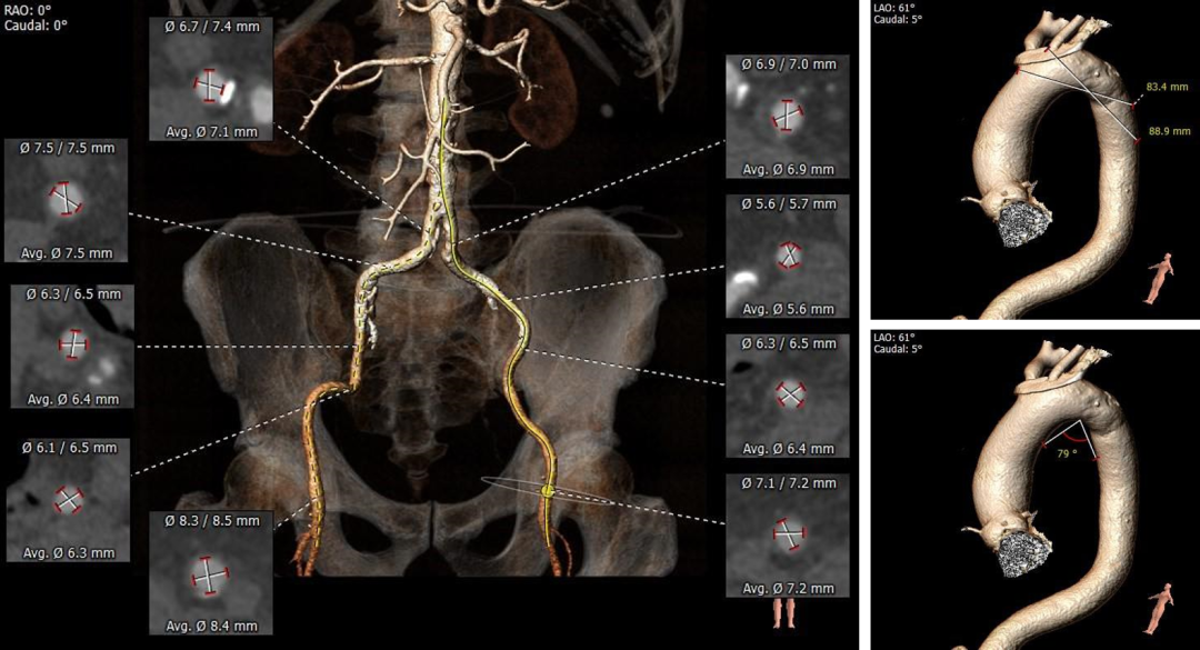 • 瓣环水平夹角为58°,右侧髂总动脉条状钙化,入路血管管径良好。
