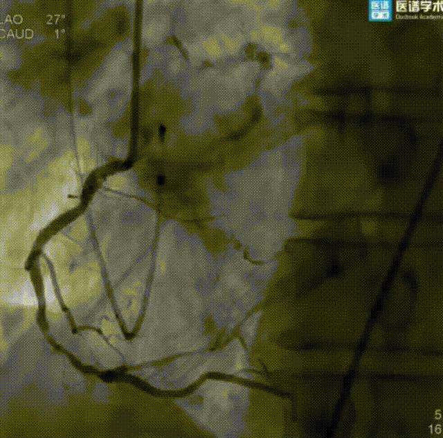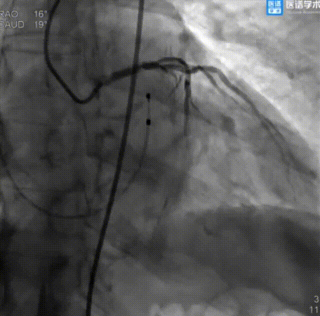 经讨论,决定对LM行PCI治疗,先送入切割球囊至LM开口病变处行预扩张,后送入支架释放,即刻造影结果显示无残余狭窄及夹层,且前向血流TIMI Ⅲ级。