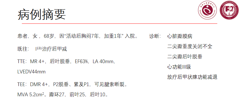 患者为一名68岁高龄女性,因“活动后胸闷7年,加重1年” 入院。二尖瓣重度关闭不全并二尖瓣后叶脱垂,心功能III级,属于外科高危人群。