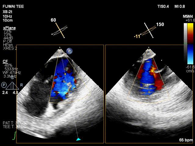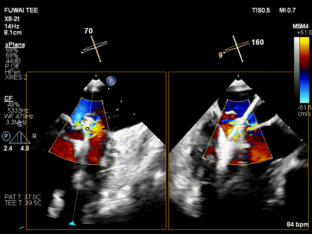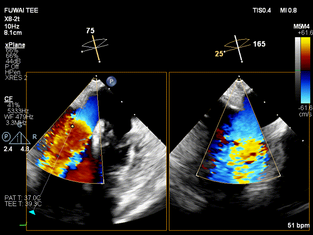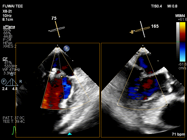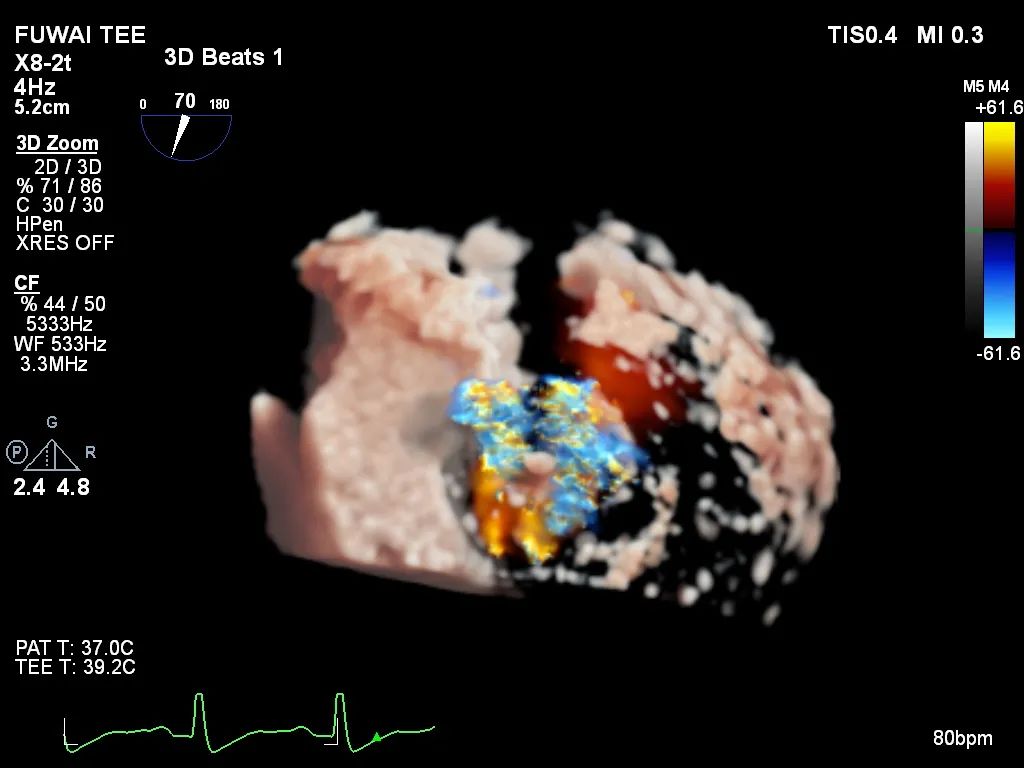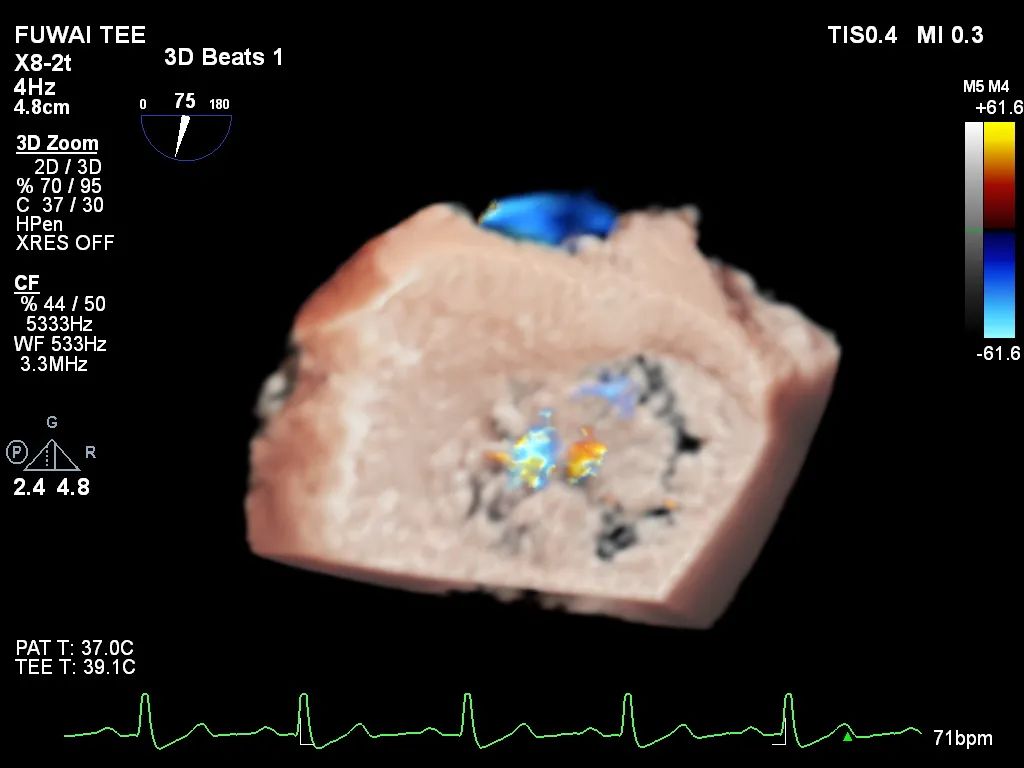 手术团队使用MitraClip®独特的三层双调弯导管,经股静脉穿刺,在食道超声引导下完成房间隔穿刺。穿刺后将导管送入左心房,对准二尖瓣目标位置P2区域。准确捕捉瓣叶,二尖瓣夹释放后,超声显示反流几近消失,患者各项生理指标正常,手术顺利完成。