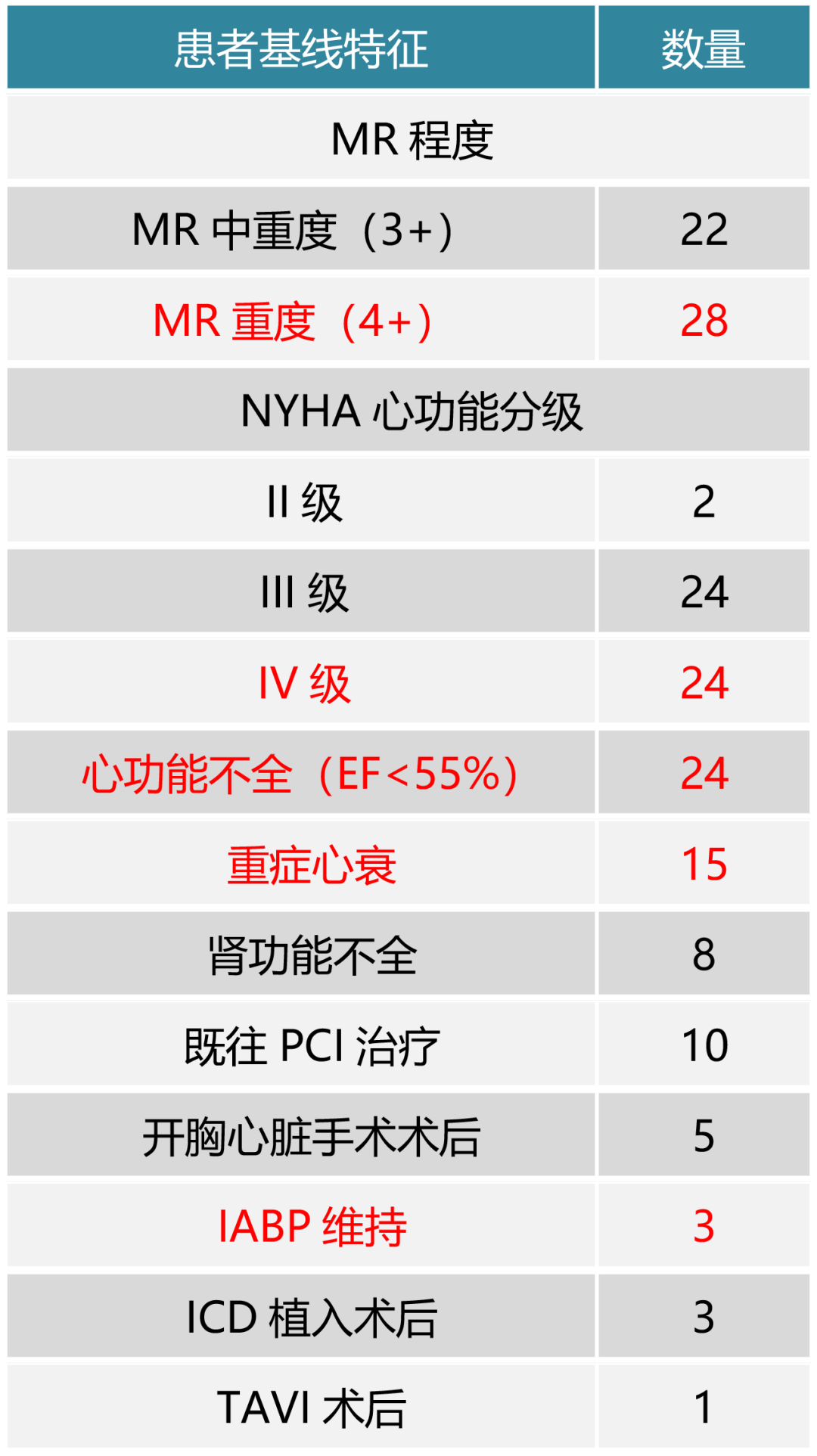据潘湘斌教授介绍,团队目前共完成MitraClip®手术50例,男性33例,女性17例;其中DMR30例,FMR13例,Mixed 7例;中位年龄为70(28-86)岁。