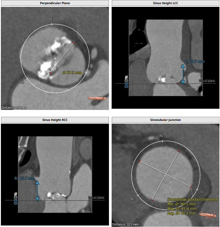 患者为type0二叶瓣,重度钙化,78度大横位心,左心明显扩大,EF值为21%,瓣环径为30.1,LVOT31.5,二叶瓣鱼嘴开口初短径为31,钙化融合至对侧为27.5,左右冠高度均为25.7,升主明显扩张。