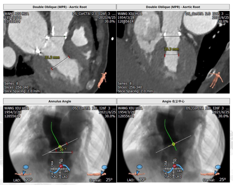 测量perimount 27瓣膜瓣环,同时评估拟植入26型号SAPIEN 3瓣膜对于左室流出道的影响,还有生物瓣投射角度分析,房间隔穿刺及距离二尖瓣生物瓣的距离分析,详细见下图(图6)。