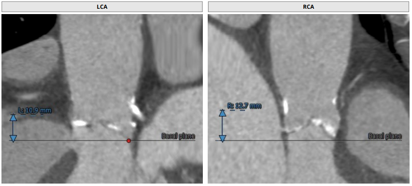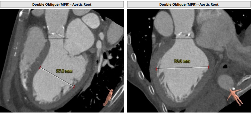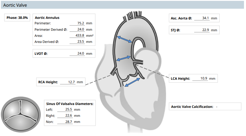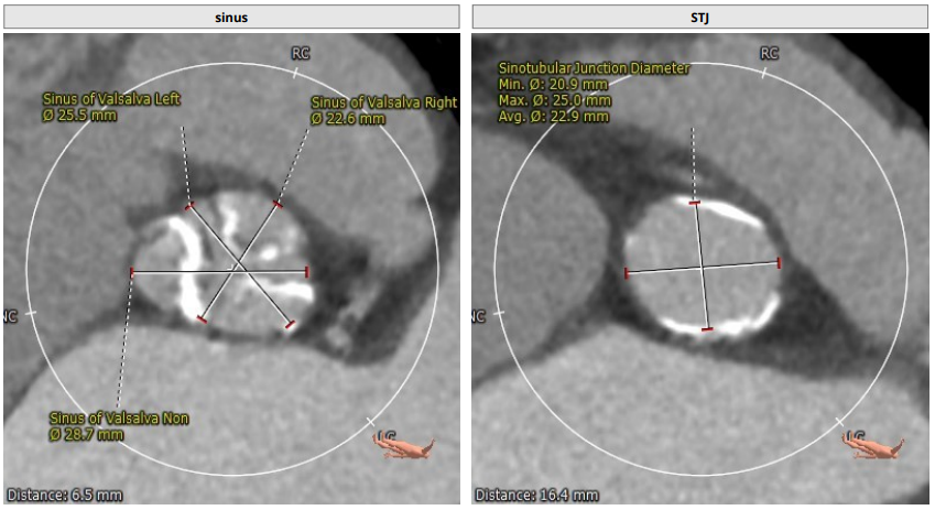 · 三叶瓣,中度钙化。整体结构呈上小下大,法式窦结构小,左冠瓣叶长度较长,流出道大。