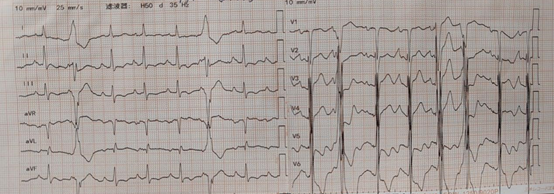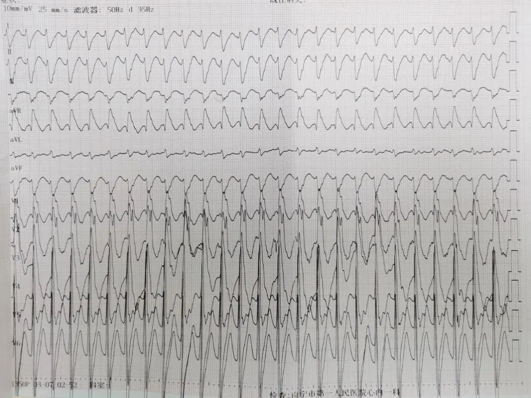 室速心电图给予起搏器超速抑制后转为窦性心律,但仍可见频发室性早搏