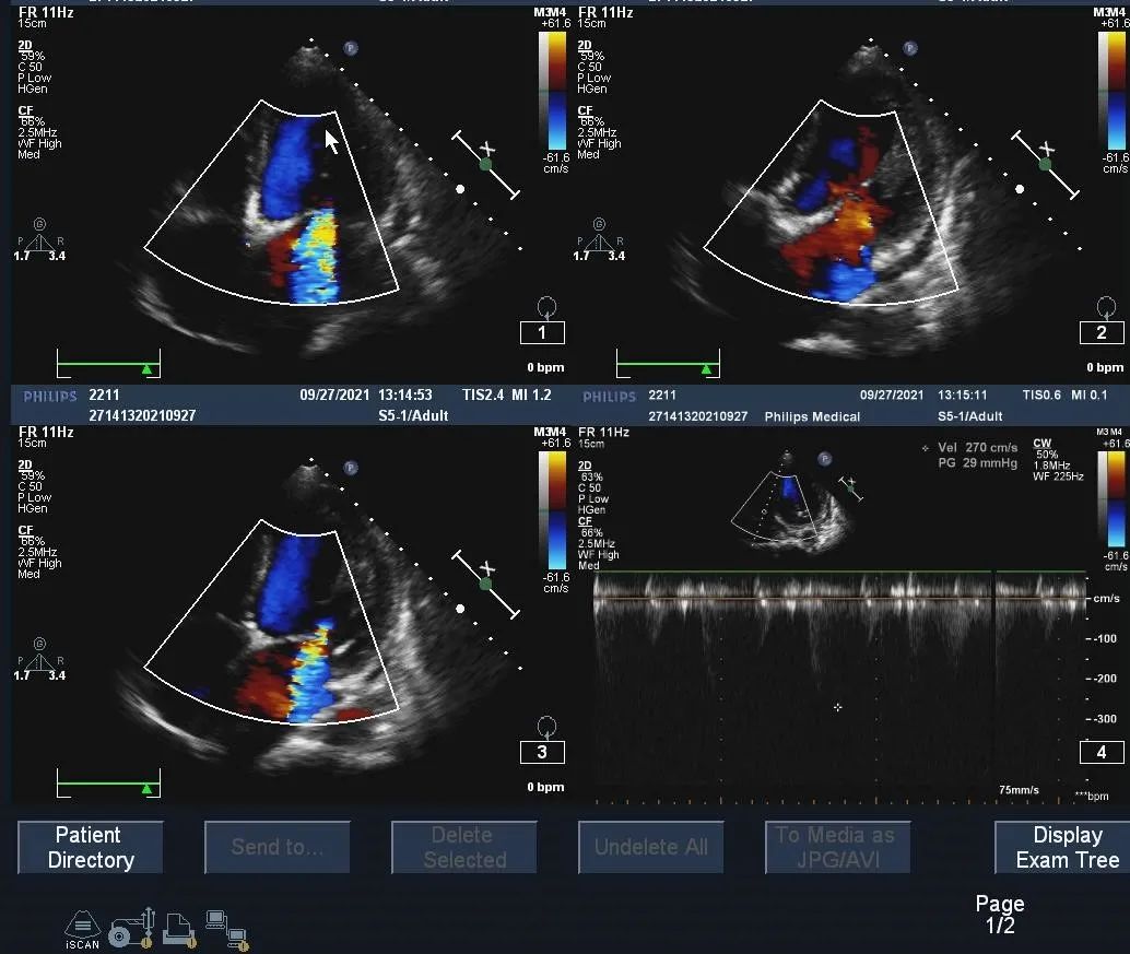 2.主动脉瓣叶及结构显示不清,瓣膜明显增厚钙化,似呈纵裂式二叶瓣,开放明显受限,过瓣流速428cm/s,最大压差73mmHg,关闭欠佳,二尖瓣瓣环增宽,大量返流。余瓣膜形态及运动未见异常