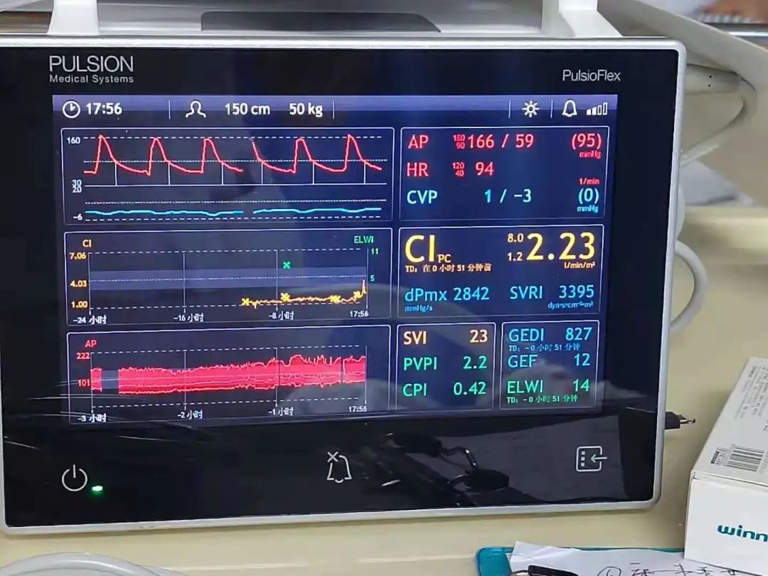 2021.9.27患者术后Picco监测提示心功能差,CI、CPI、GEF等心脏做功指标较低,后负荷(SVRI)高,血容量指标(GEDI)尚可,而肺淤血渗出指标(ELWL)增加等情况,术后立即给予强心、利尿及减轻心脏后负荷等处理,维持液体负平衡,患者心功能逐渐改善,CI由术后1.39 L/min/m2升至停止Picco前的2.23 L/min/m2,外周血管阻力由4913 dyn.s.cm-5.m2 降至2091 dyn.s.cm-5.m2 ,CPI从0.21w/m2升至0.42w/m2,GEF由7%提高至16%,GEDI维持平衡,ELWL从21mL/kg降至16mL/kg,继续予新活素扩张动静脉,降低心脏前后负荷等处理,2021.9.29血流动力学基本稳定,查体双肺听诊无干湿性啰音,观察患者自主呼吸良好,血氧饱和度正常,四肢肌活动有力,顺利撤除呼吸机辅助通气,2021.9.30停止Picco监测,将于近日康复出院。