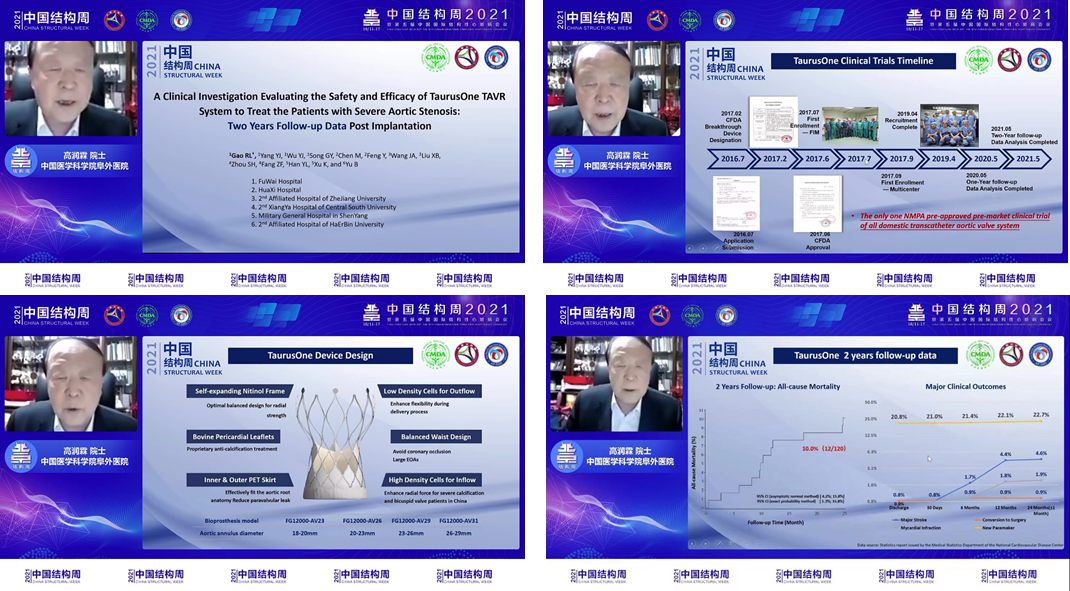 中国医学科学院阜外医院高润霖院士公布了评价TaurusOne TAVR系统治疗严重主动脉狭窄患者的安全性和有效性的临床研究:植入后2年随访数据。高院士强调,TaurusOne是目前国内唯一一款上市前研究方案经过NMPA批准的临床研究,且全由国内术者独立完成。此项研究纳入6家中心、120例病人,STS评分高达9.95±3.08,2年后全因死亡率为10%,明显低于国际大规模临床试验,2年后中重度瓣周漏发生率仅为1.12%,NYHA II~III占97%,亚组分析,二叶瓣患者与三叶瓣瓣患者相关终点事件,无显著性差异。最后,高院士再次高度肯定了TaurusOne TAVR系统优异的临床表现,相信Taurus介入瓣膜能帮助更多患者。