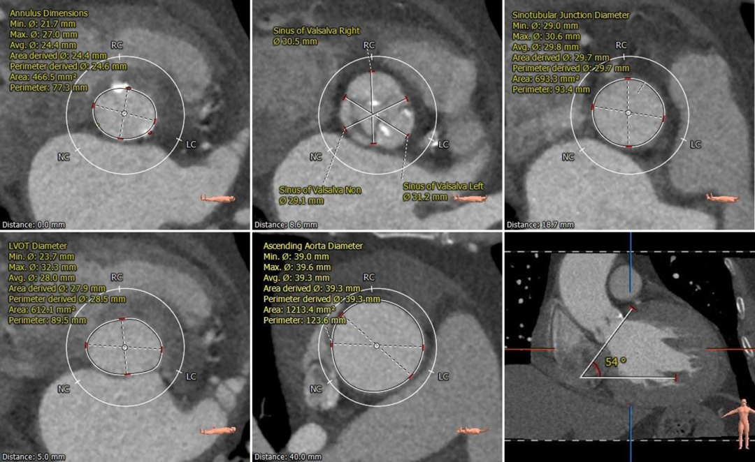 • 三叶式瓣,中度钙化,左右窦内钙化聚集向瓣环延伸,预估锚定难度适中,瓣膜植入后受团状钙化挤压存在瓣周漏风险;