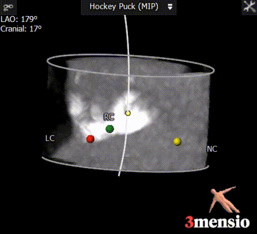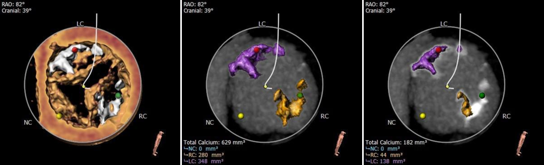 该病例为三窦式,无冠窦先天发育畸形,窦内空间小并存在嵴样间隔,钙化主要分布在左右窦接近窦底位置并向下延伸,左窦瓣叶略长,可疑阻挡风险,术中需加以关注。