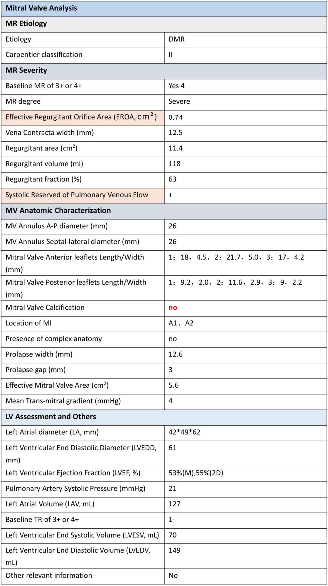 基本情况:81岁女性,患者1月前活动后出现喘憋症状,呈阵发性,每次持续3~5分钟,无大汗、无心前区压榨性疼痛,无濒死感,无头痛,无意识障碍,经休息后可缓解,1月来上述症状多次发作,自述发作与活动无关,外院行超声心动提示:二尖瓣大量反流、二尖瓣前叶脱垂,予患者口服药物治疗,上述症状改善不明显,为进一步治疗就诊于我院,行超声心动:二尖瓣前叶A1、A2区脱垂,DMR,Carpentier II型,二尖瓣重度关闭不全(重度,4级),为进一步诊治收入院。