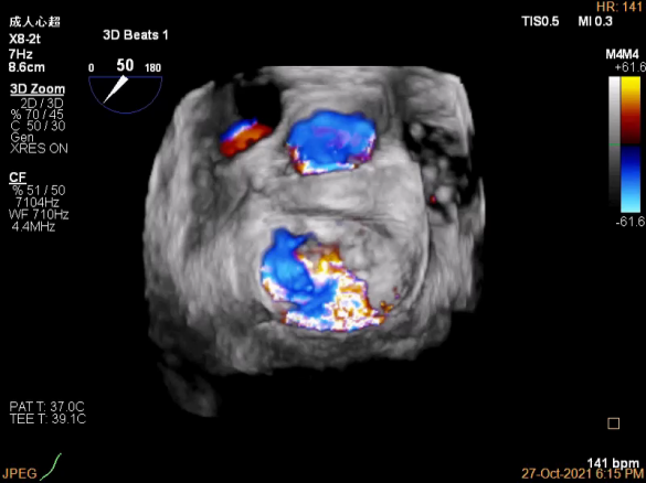 (1)本例患者为DMR,可见明显的A1和A2区脱垂,究竟应该夹合哪个位置?如果选择脱垂最重的位置A1/P1区,将面临后瓣Tething的改变,瓣叶长度不够。所幸通过二维和三维的Color发现主要的Jet来源于A2区域,因此首次夹合位置应该确定为返流最重的A2区域略偏A1区,此处后瓣长度很理想。