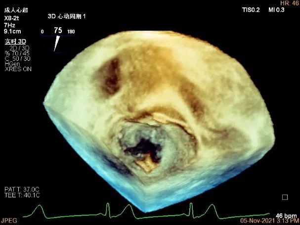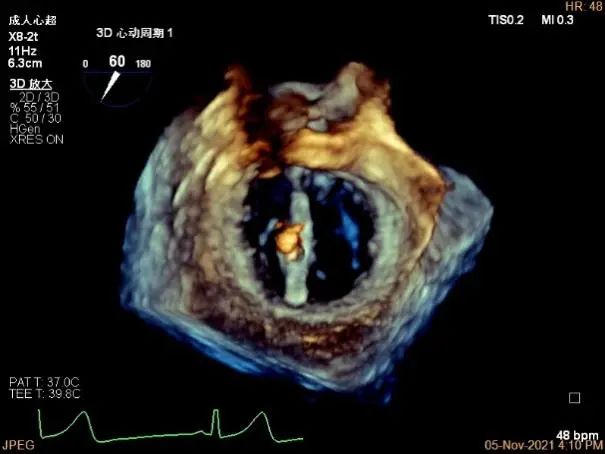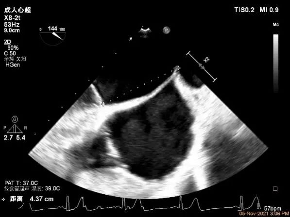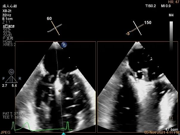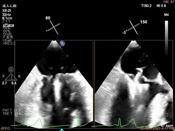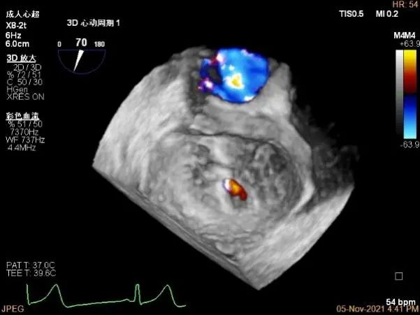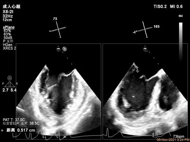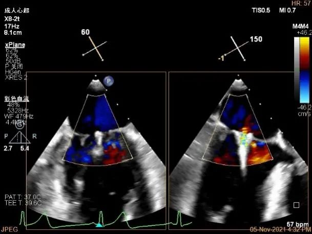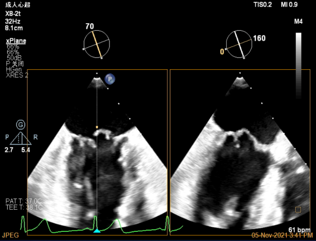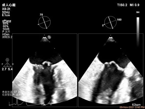 患者麻醉方式为全麻,建立静脉通路后,穿刺右侧股静脉,预埋ProGlide缝合器,食道超声指导下房间隔穿刺成功,将Superstiff导丝送至左房,沿导丝将导引导管送入左房,MitraClip调整后顺利到达二尖瓣目标位置,在食道超声辅助下,将MitraClipXTR成形夹精确定位后,成功夹合二尖瓣A2-P2区,超声显示反流明显减少,多切面证实夹合组织充分,肺静脉多普勒波形由反向恢复正常,手术顺利结束,安返普通病房。