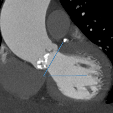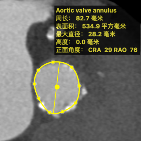 心脏CTA评估显示:Sievers 1型二叶式主动脉瓣,瓣叶明显增厚并重度钙化;瓣环周长82.7mm,瓣环面积534.9mm²;左冠状动脉开口高度12.6mm,右冠状动脉开口高度14.9mm;升主动脉最大直径60mm;横位心,瓣环角度60度。